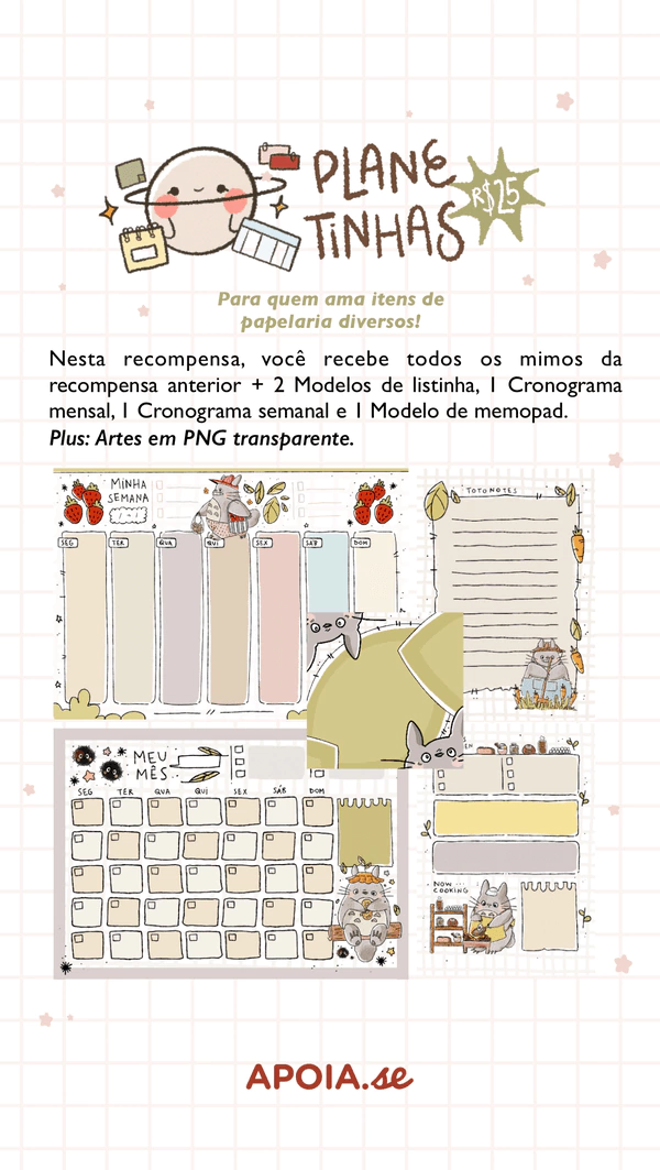 - Você vai receber a recompensa "PLANETINHAS" que engloba todas as demais recompensas e terá permissão de uso comercial livre sem restrição para usar da forma que quiser. Créditos não são necessários, mas caso queira dar fique à vontade. Todo tipo de ideia pode ser aplicada para a compra dessa recompensa.