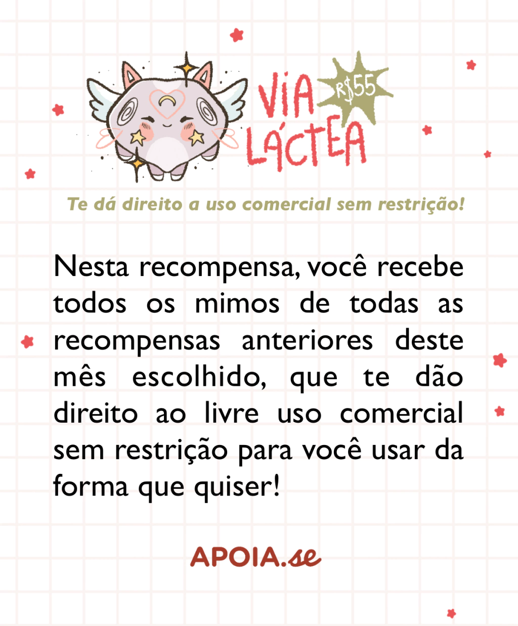 - Você vai receber a recompensa "galáxias" que engloba todas as demais recompensas e terá permissão de uso comercial livre sem restrição para usar da forma que quiser. Créditos não são necessários, mas caso queira dar fique à vontade. Todo tipo de ideia pode ser aplicada para a compra dessa recompensa.