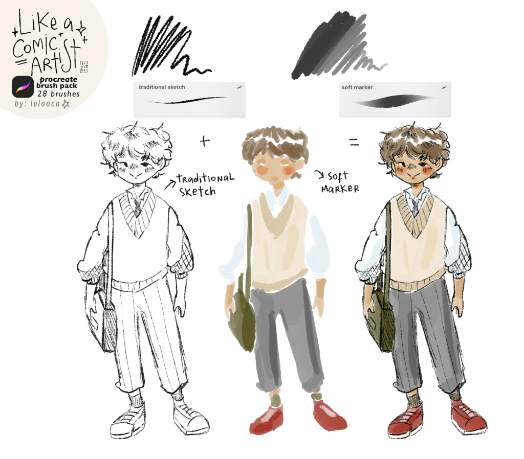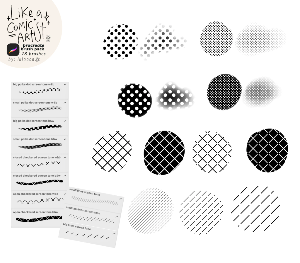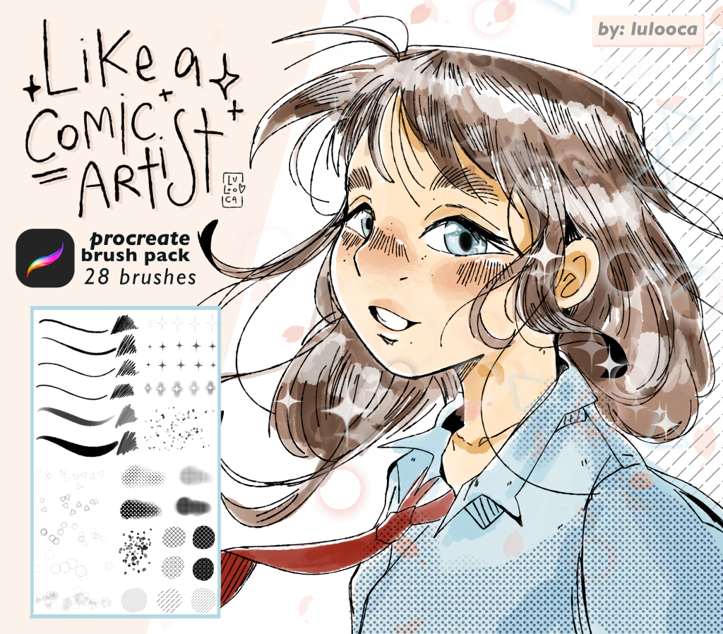 Um pack com 28 brushes exclusivos feitos pela Lulooca, para você baixar e usar apenas no Procreate