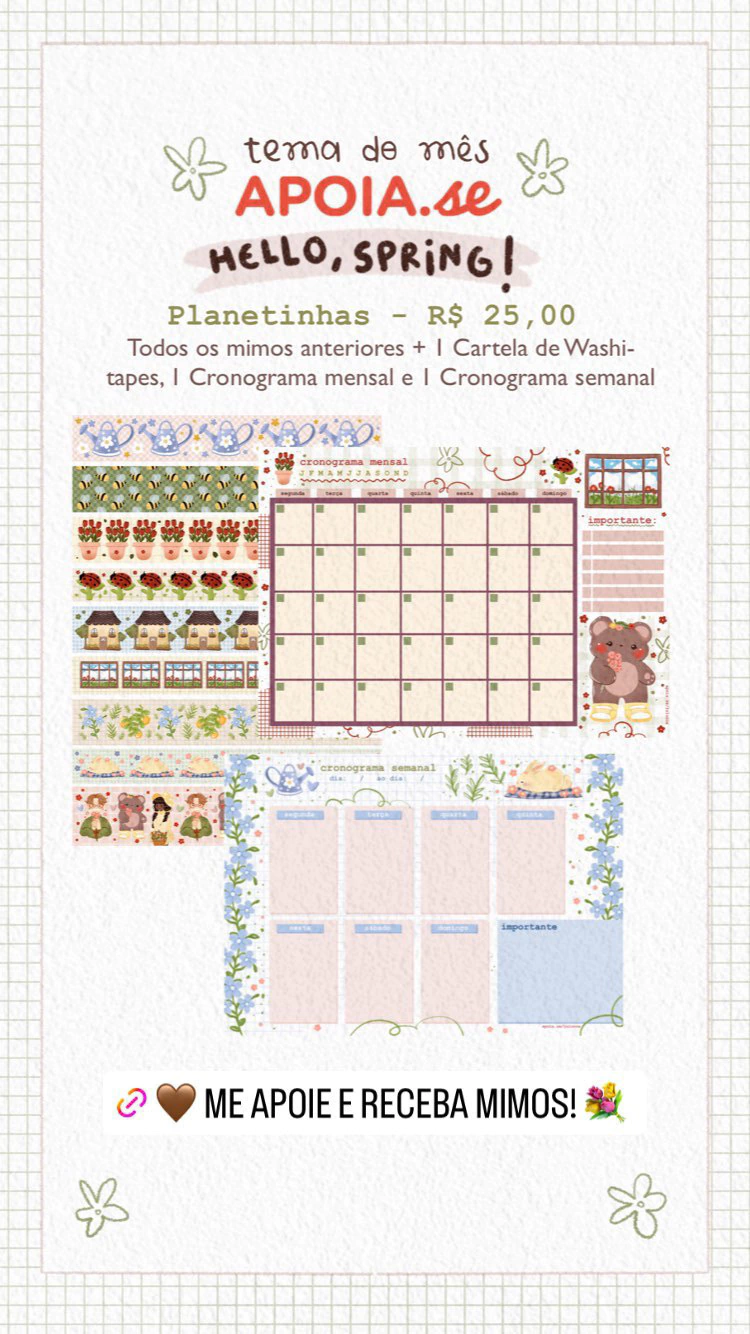 - 3 Cartelas de adesivos funcionais (dias da semana, meses, habit tracker, listinha, símbolos e números)