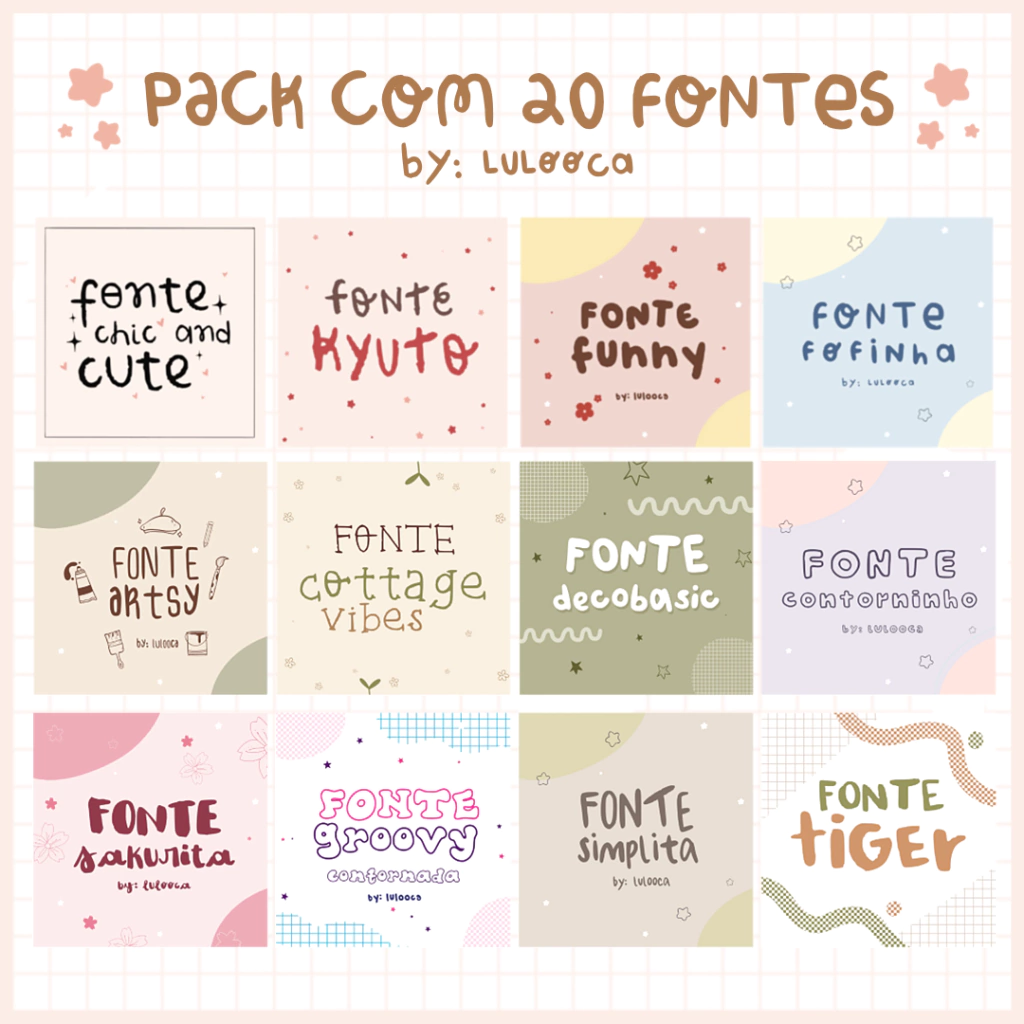 Nesse super pack ultra especial exclusivo do Luloovembro - um mês inteiro especial cheio de descontos - você vai estar levando todas as 20 fontes existentes na Luloojinha, desenvolvidas inteiramente pela Lulooca pelo preço maravilhoso de R$ 37,00. O pack todo contêm: